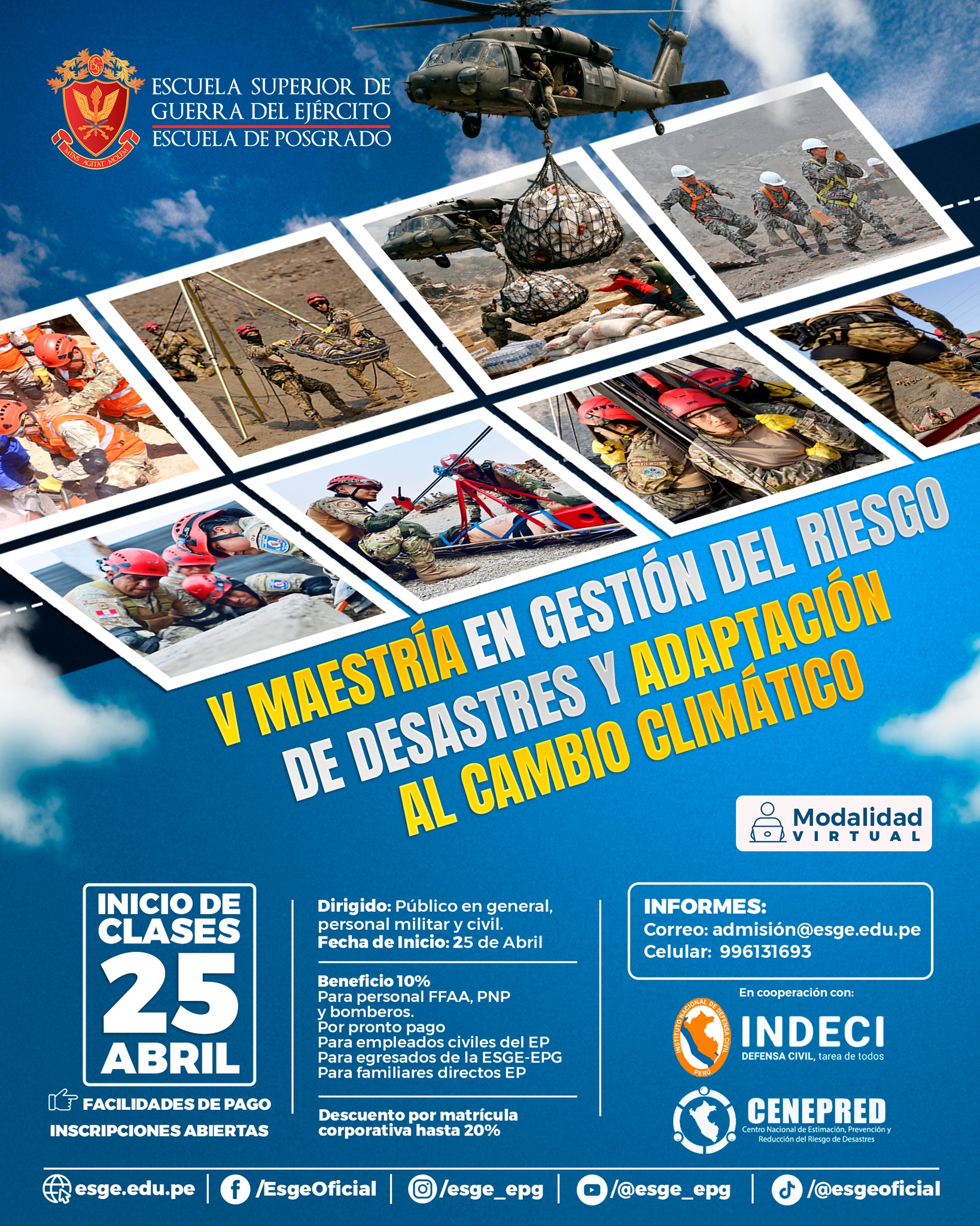 La Escuela Superior de Guerra del Ejército – Escuela de Posgrado anunció el lanzamiento de la V Maestría en Gestión del Riesgo de Desastres y Adaptación al Cambio Climático, programa académico orientado a formar profesionales capaces de prevenir, gestionar y enfrentar emergencias, desastres naturales y los efectos del cambio climático.
