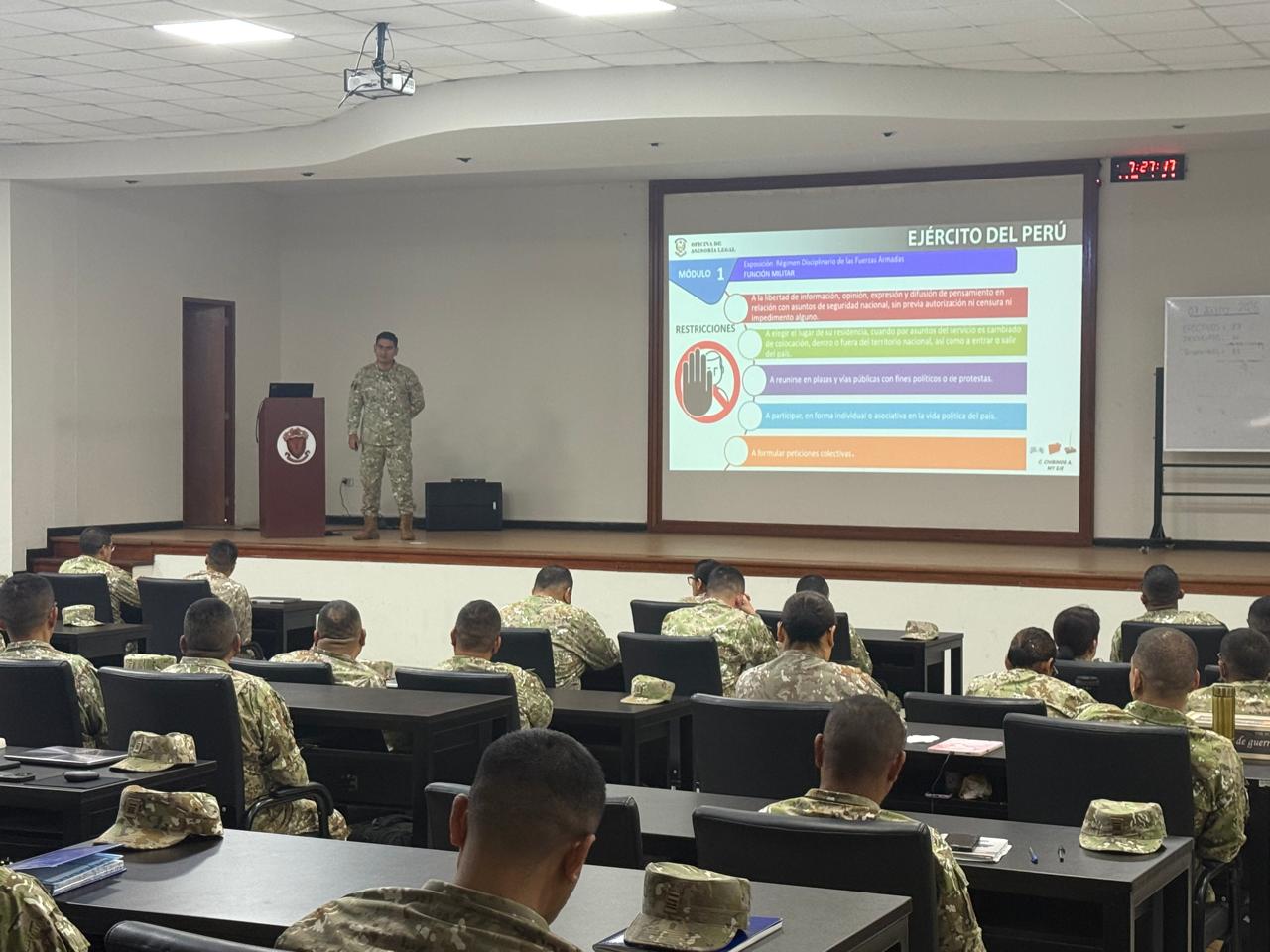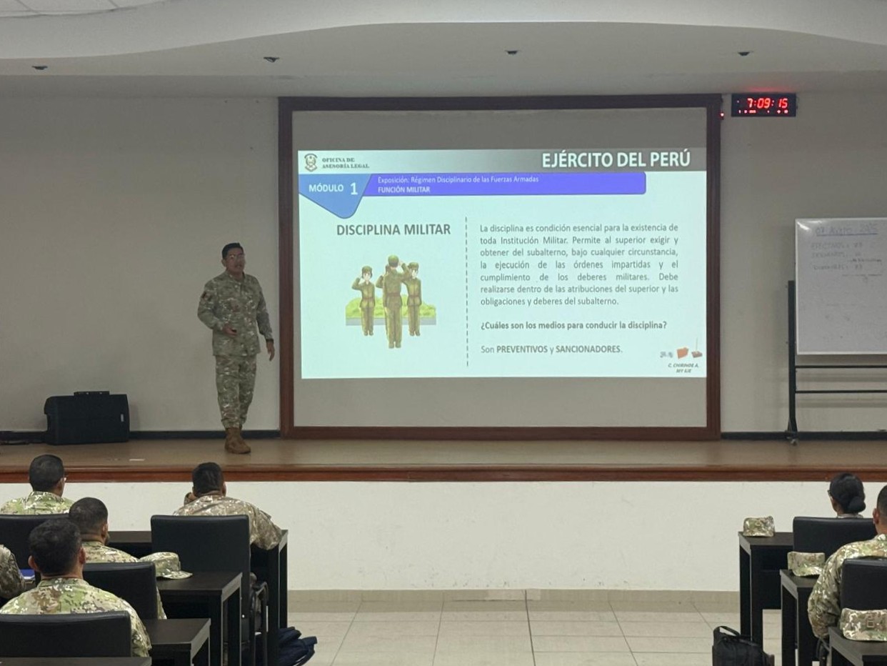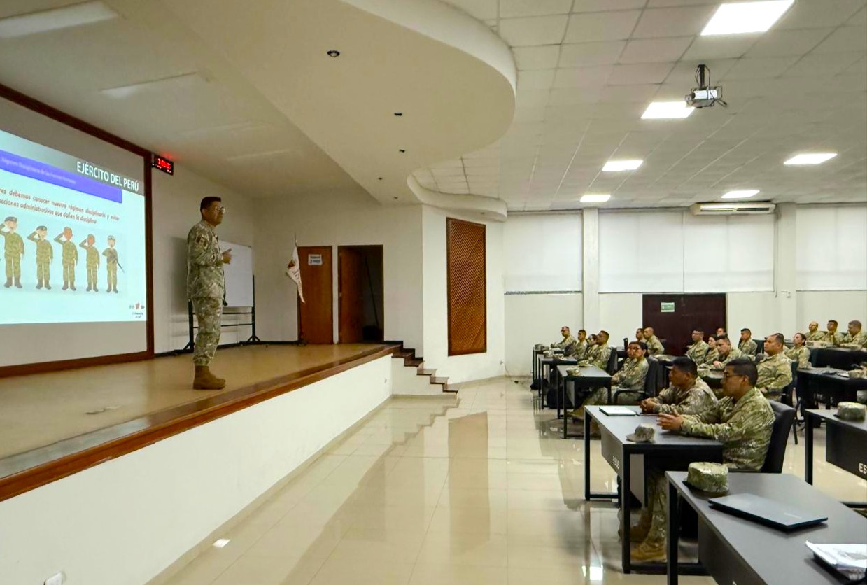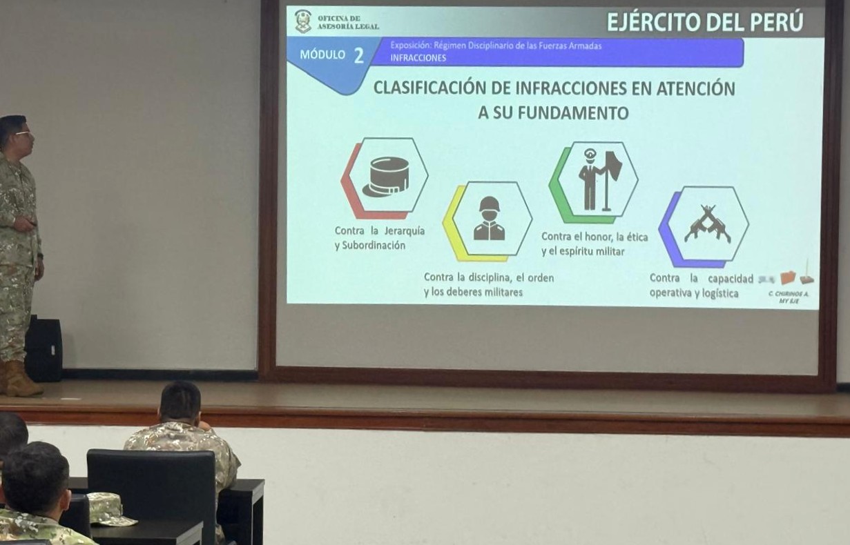 Los oficiales estudiantes del Diplomado de Técnica y Estado Mayor Administrativo recibieron una instrucción especializada por parte del asesor legal de esta casa de estudios, quien abordó los fundamentos y alcances del régimen disciplinario militar. Esta sesión académica permitió fortalecer la comprensión normativa de los alumnos, reafirmando su compromiso con la ética profesional y la disciplina institucional.