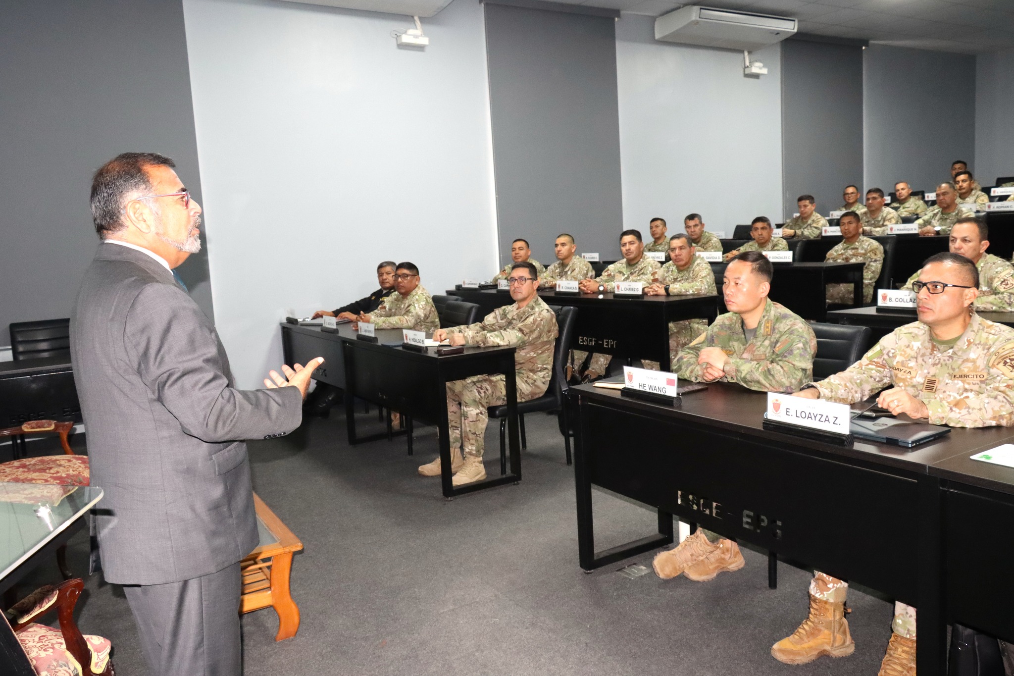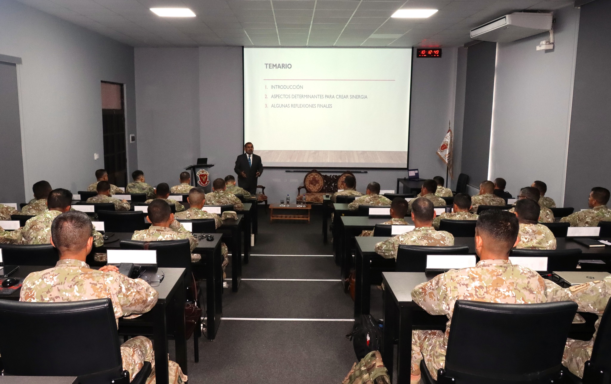 “Sinergia, requisito importante para cumplir eficazmente los roles estratégicos de las Fuerzas Armadas” fue el título de la conferencia magistral dirigida a los señores coroneles del Programa de Alto Mando del Ejército (PAME), a cargo de un distinguido ponente con reconocida trayectoria profesional en el ámbito de la defensa nacional y la gestión estratégica.