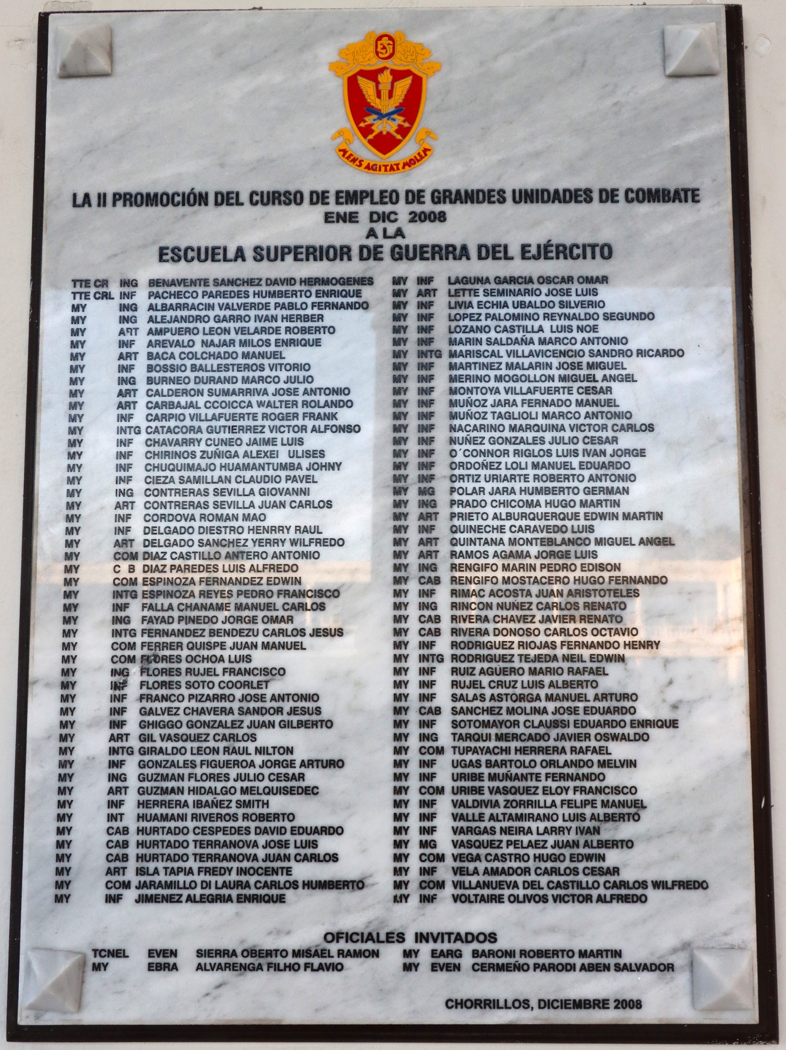 En la Escuela Superior de Guerra del Ejército – Escuela de Posgrado (ESGE–EPG) se realizó el acto de develación de la placa conmemorativa de la II Promoción del Curso de Empleo de Grandes Unidades de Combate, ceremonia que reunió a oficiales integrantes de dicha promoción en un ambiente de unión, camaradería y tradición.