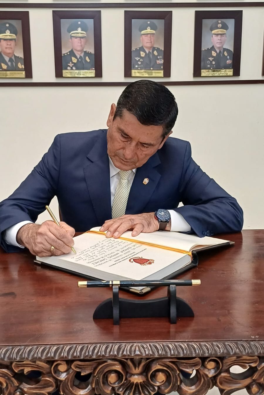 Durante la ceremonia, el Presidente del Consejo de Ministros suscribió el Libro de Oro de la Escuela, dejando constancia de su visita y fortaleciendo los lazos con esta casa de estudios.
