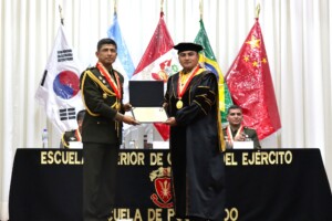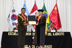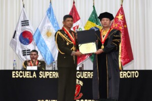 Durante la ceremonia, el señor General de Brigada Juan Valverde Vírhuez, Director de esta prestigiosa casa de estudios, hizo entrega de los diplomas de otorgamiento del grado académico de magister y medallas correspondientes a los señores oficiales maestros promoción 2025; entre ellos, oficiales de las Fuerzas Armadas y Policía Nacional del Perú, y del Ejército Popular de Liberación de la República Popular China, Tte Crl EPL Yan Houyi y Tte Crl EPL He Wang.