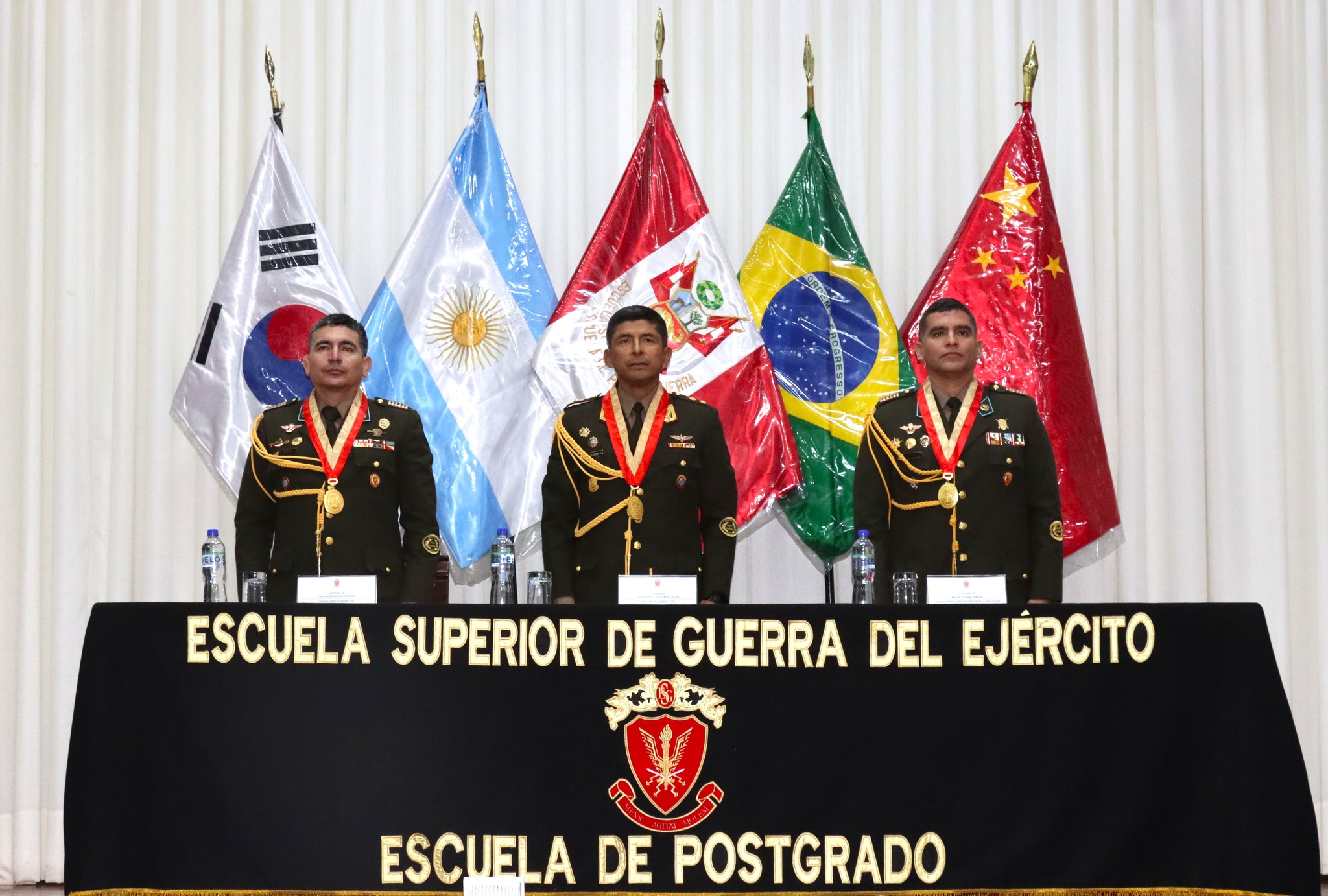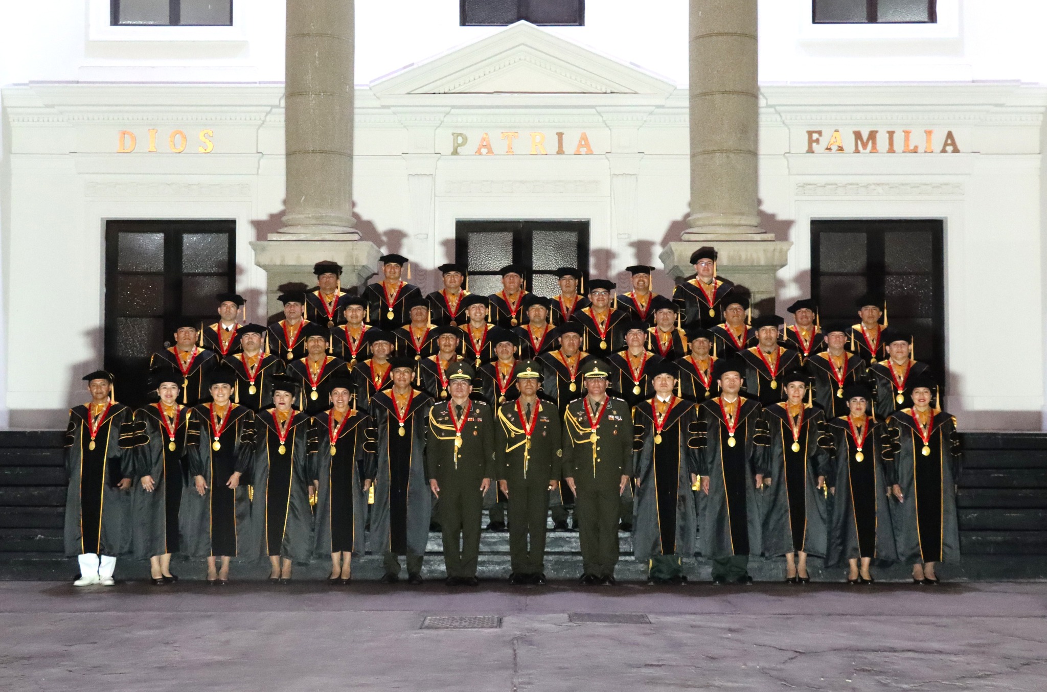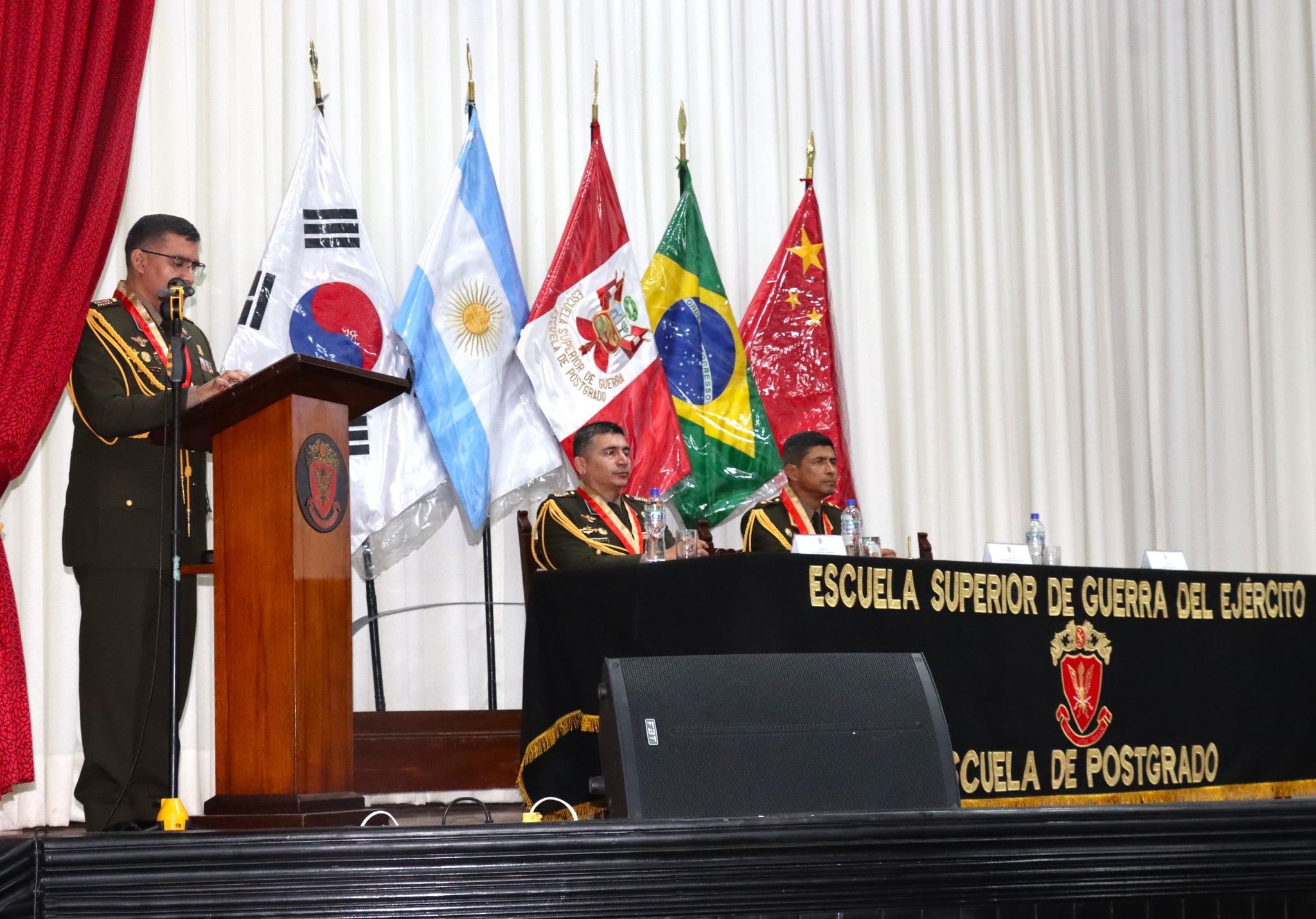 En una ceremonia marcada por el patriotismo y el reconocimiento a la excelencia académica, la Escuela Superior de Guerra del Ejército – Escuela de Posgrado llevó a cabo la solemne ceremonia de colación de los oficiales que culminaron con éxito sus programas académicos de Maestría en Estrategia y Geopolítica y Maestría en Ciencias Militares con mención en Gestión Pública y Planeamiento Estratégico.
