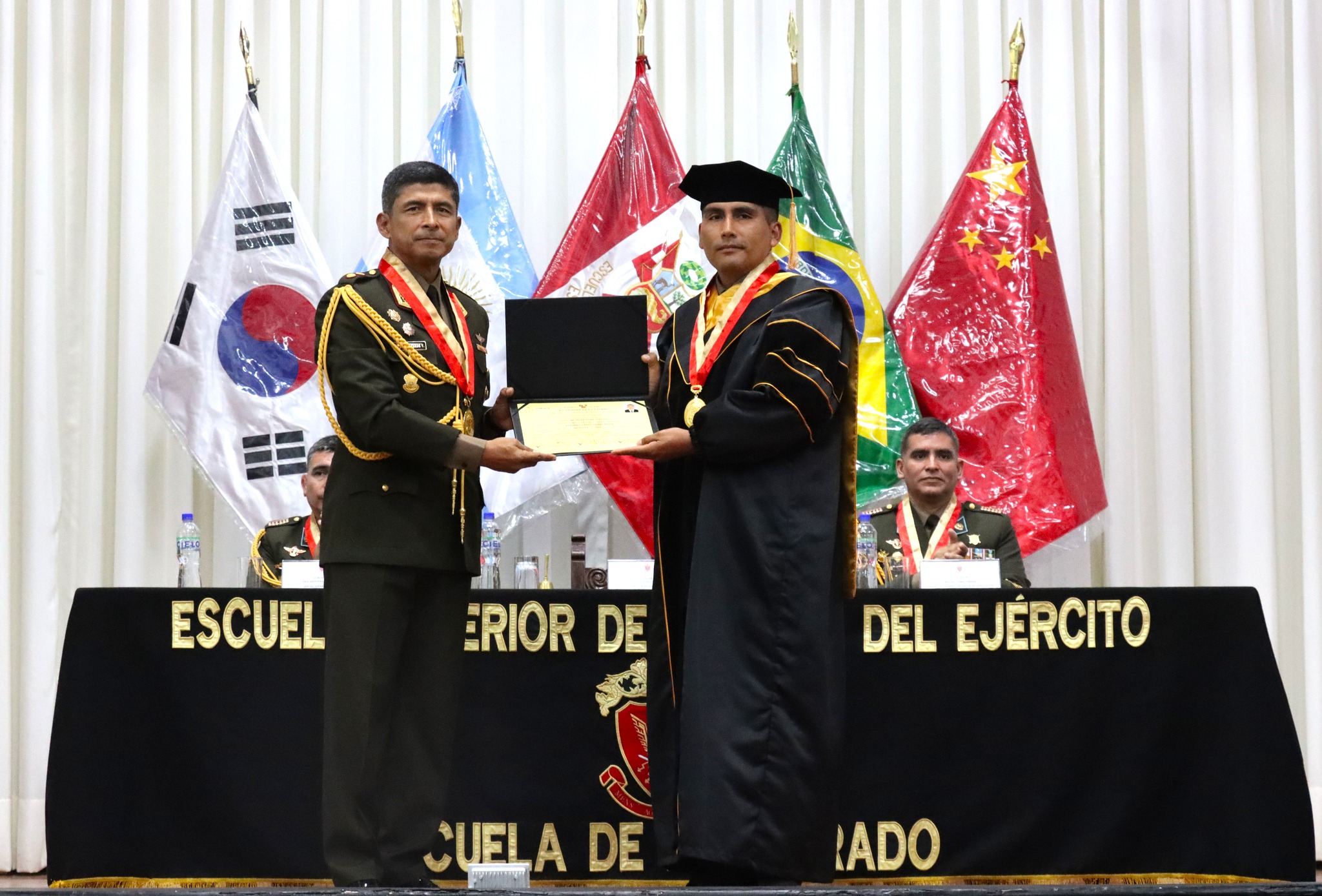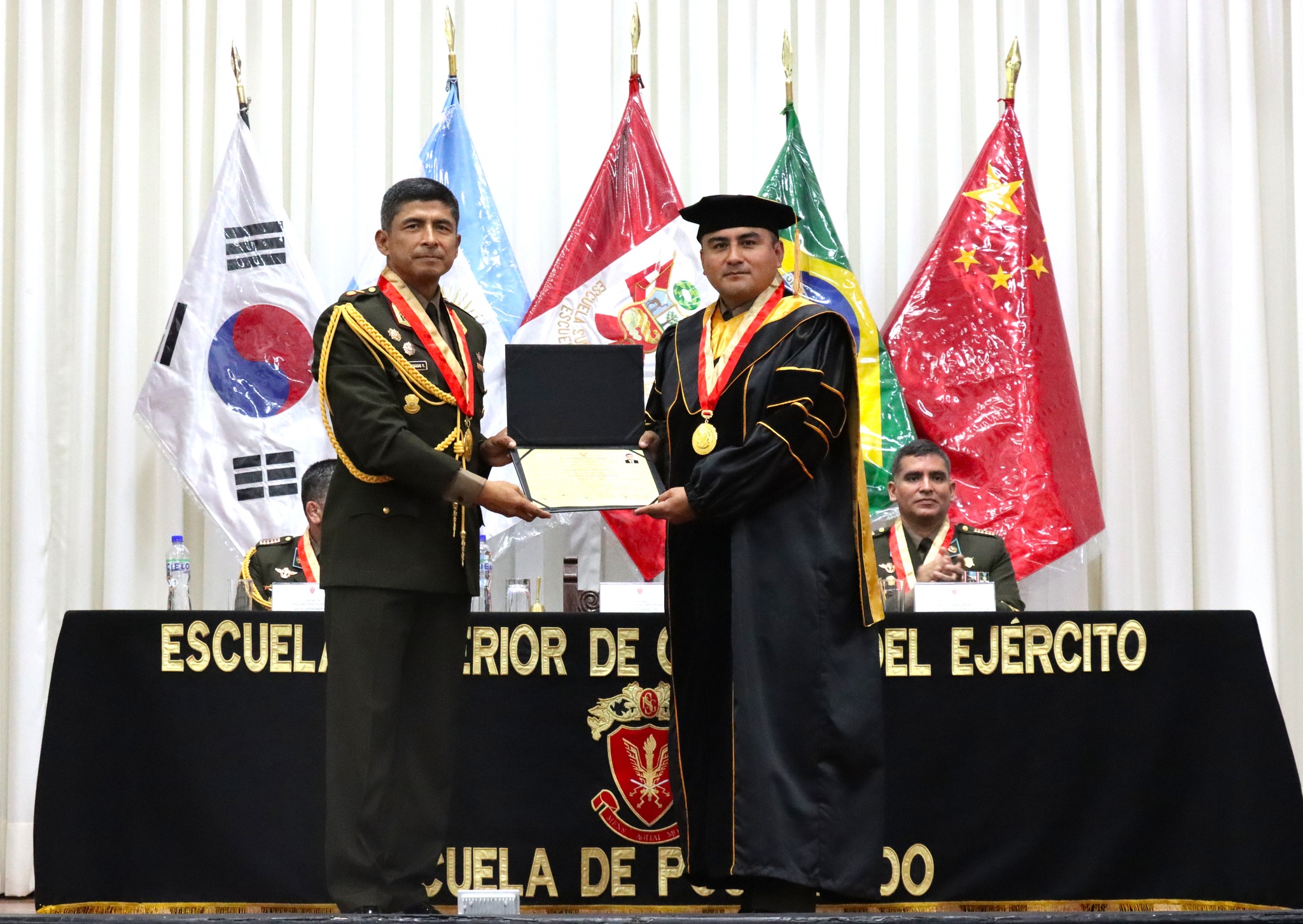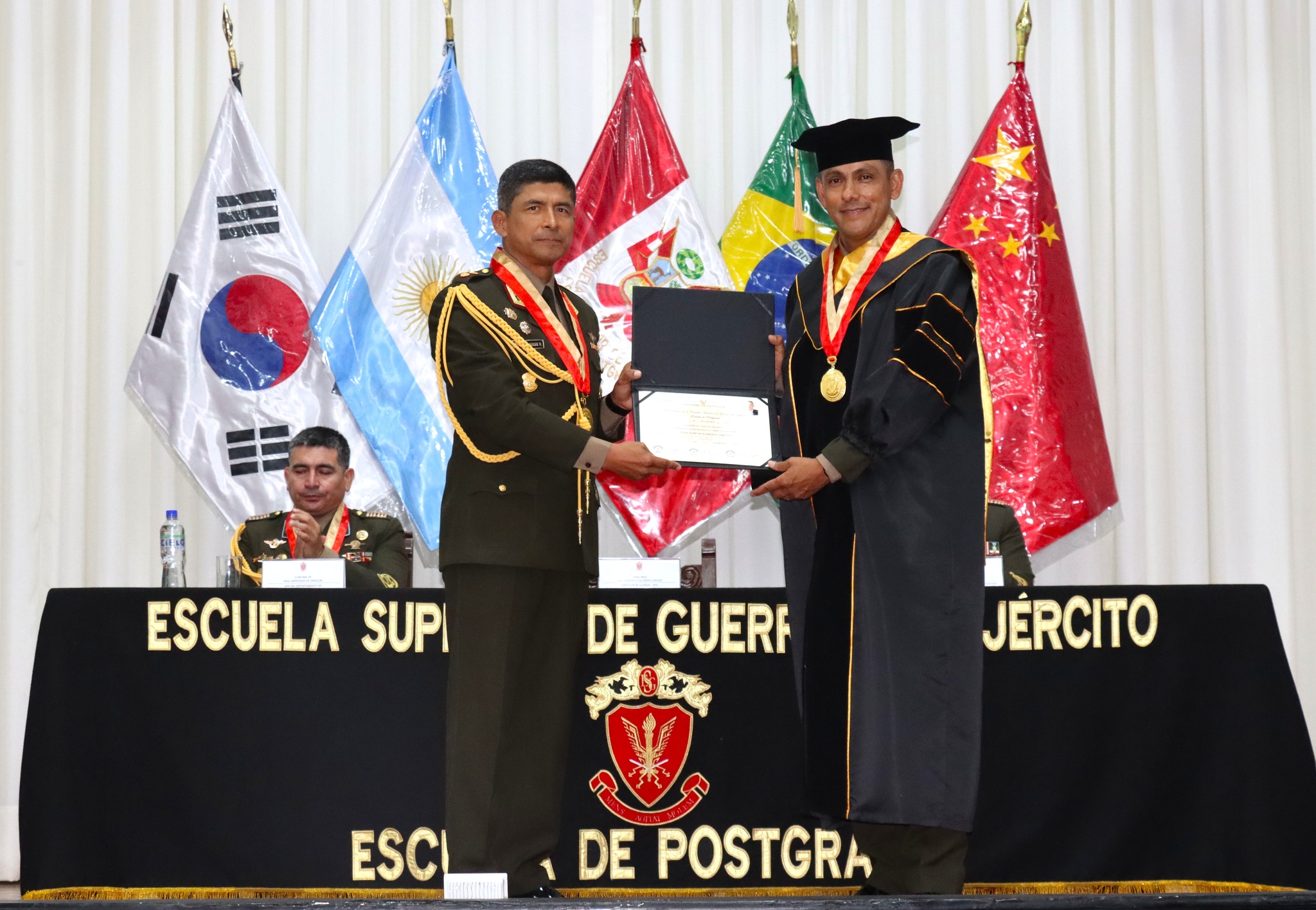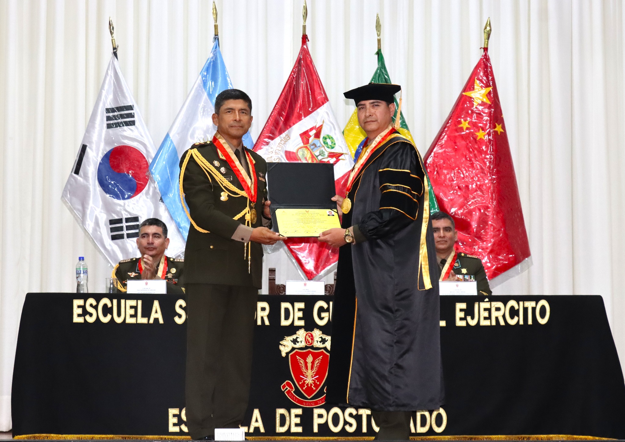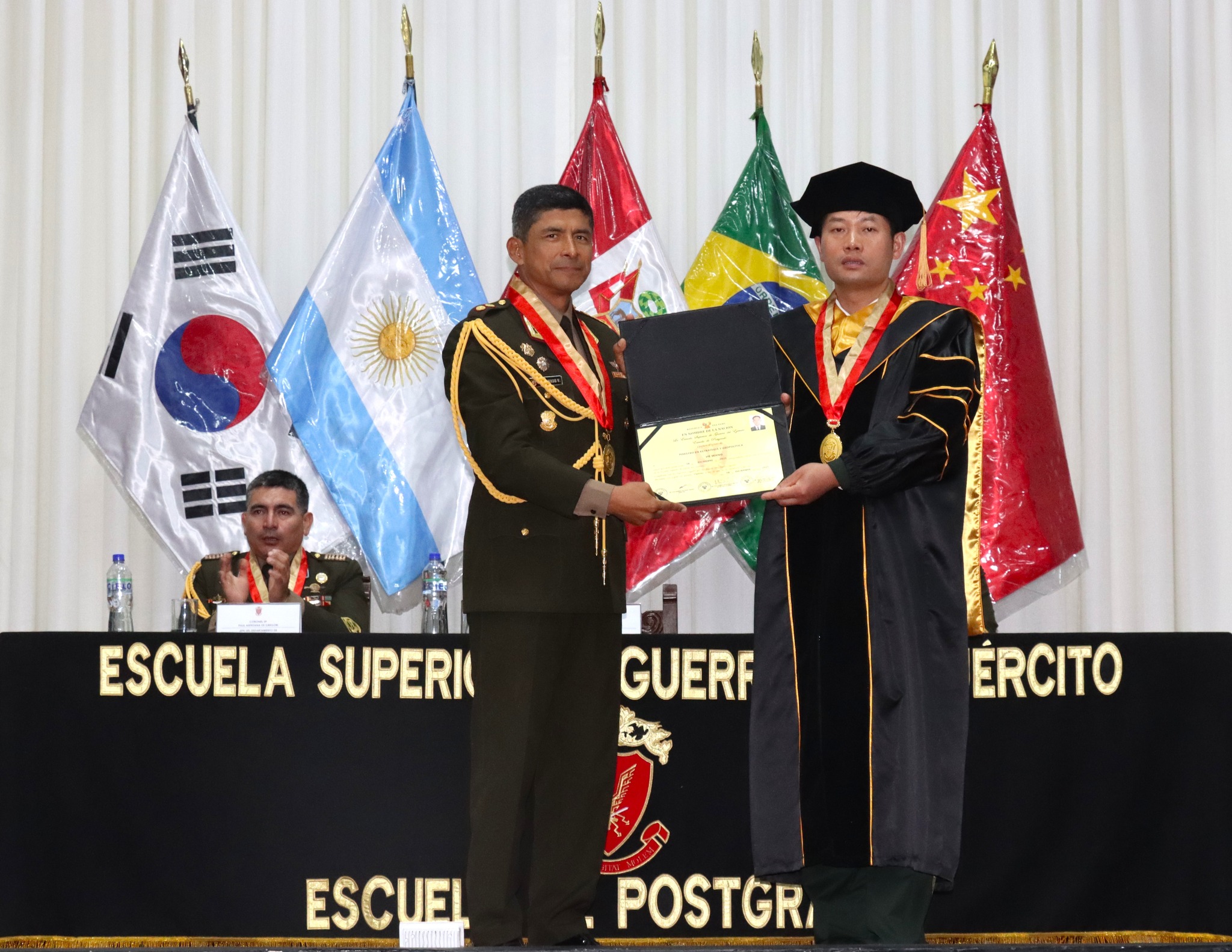 Durante la ceremonia, el señor General de Brigada Juan Valverde Vírhuez, Director de esta prestigiosa casa de estudios, hizo entrega de los diplomas de otorgamiento del grado académico de magister y medallas correspondientes a los señores oficiales maestros promoción 2025; entre ellos, oficiales de las Fuerzas Armadas y Policía Nacional del Perú, y del Ejército Popular de Liberación de la República Popular China, Tte Crl EPL Yan Houyi y Tte Crl EPL He Wang.