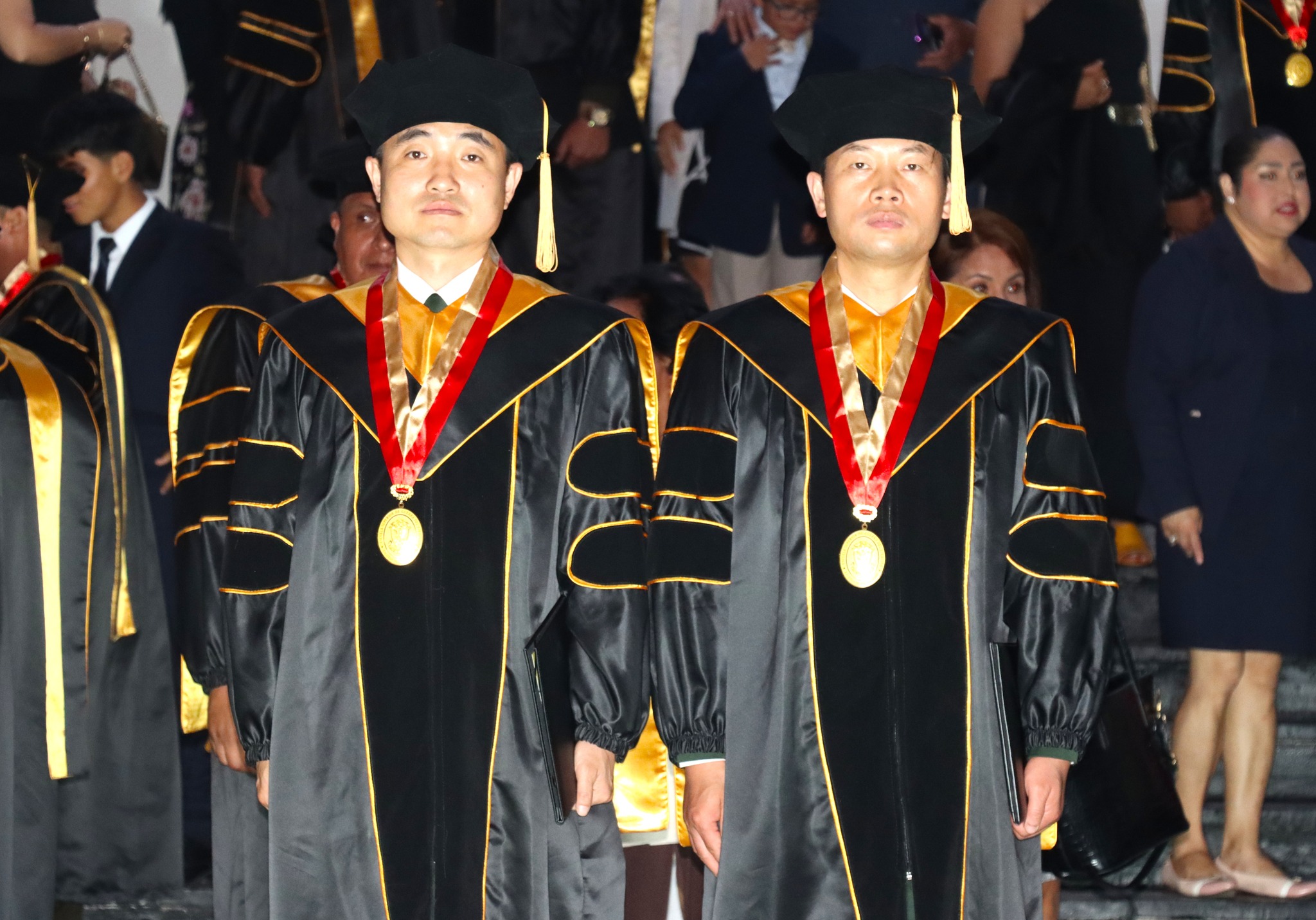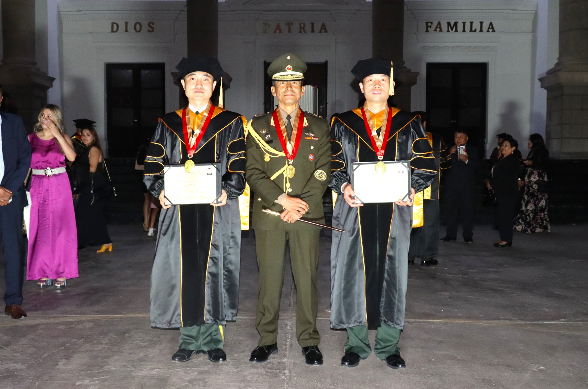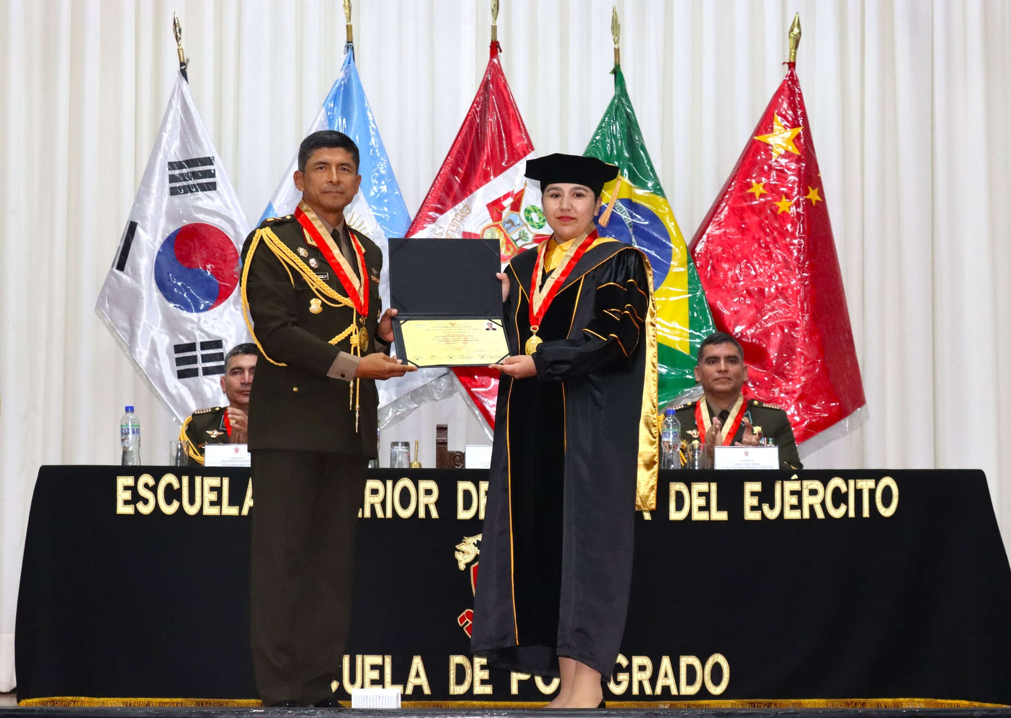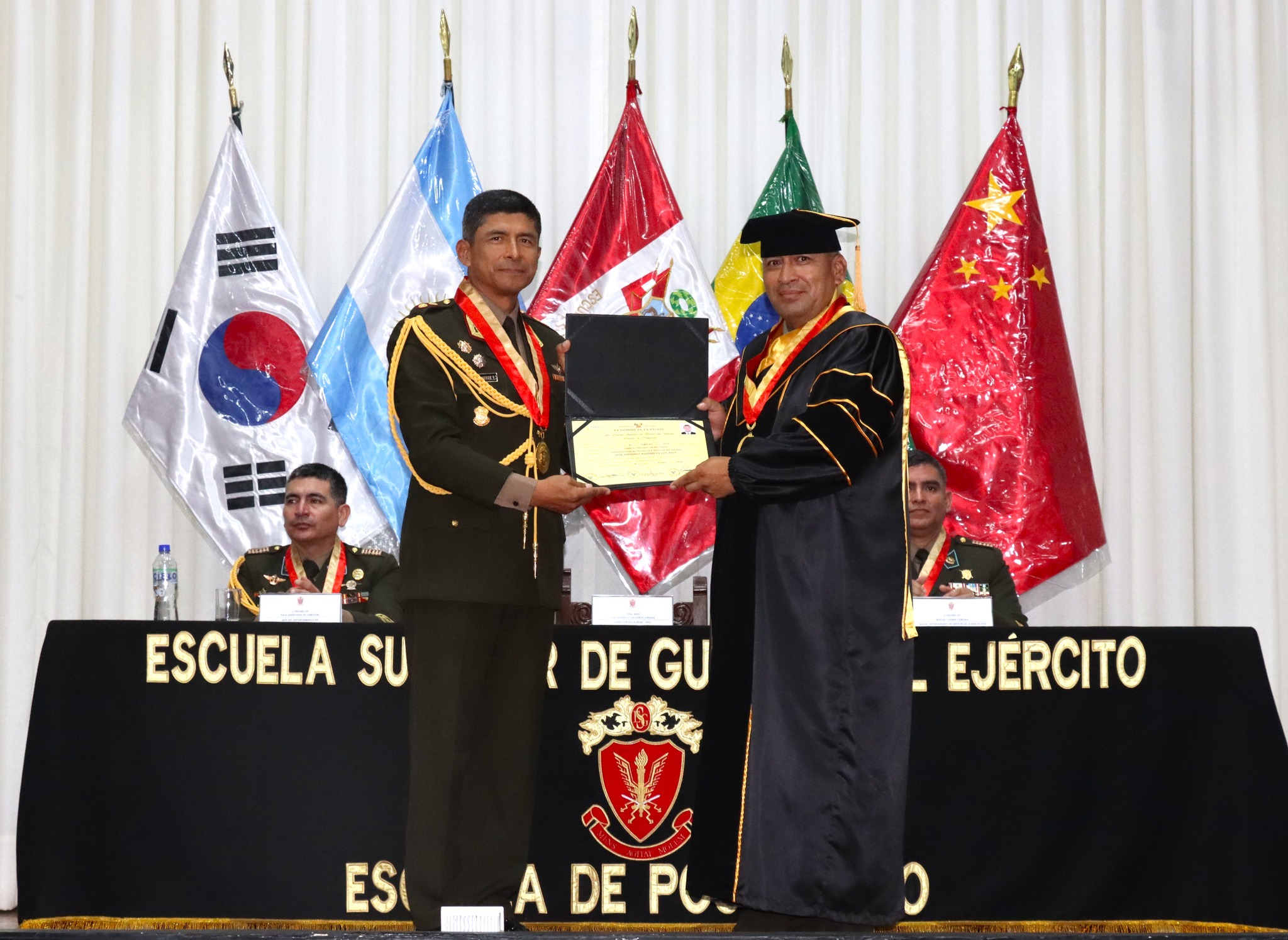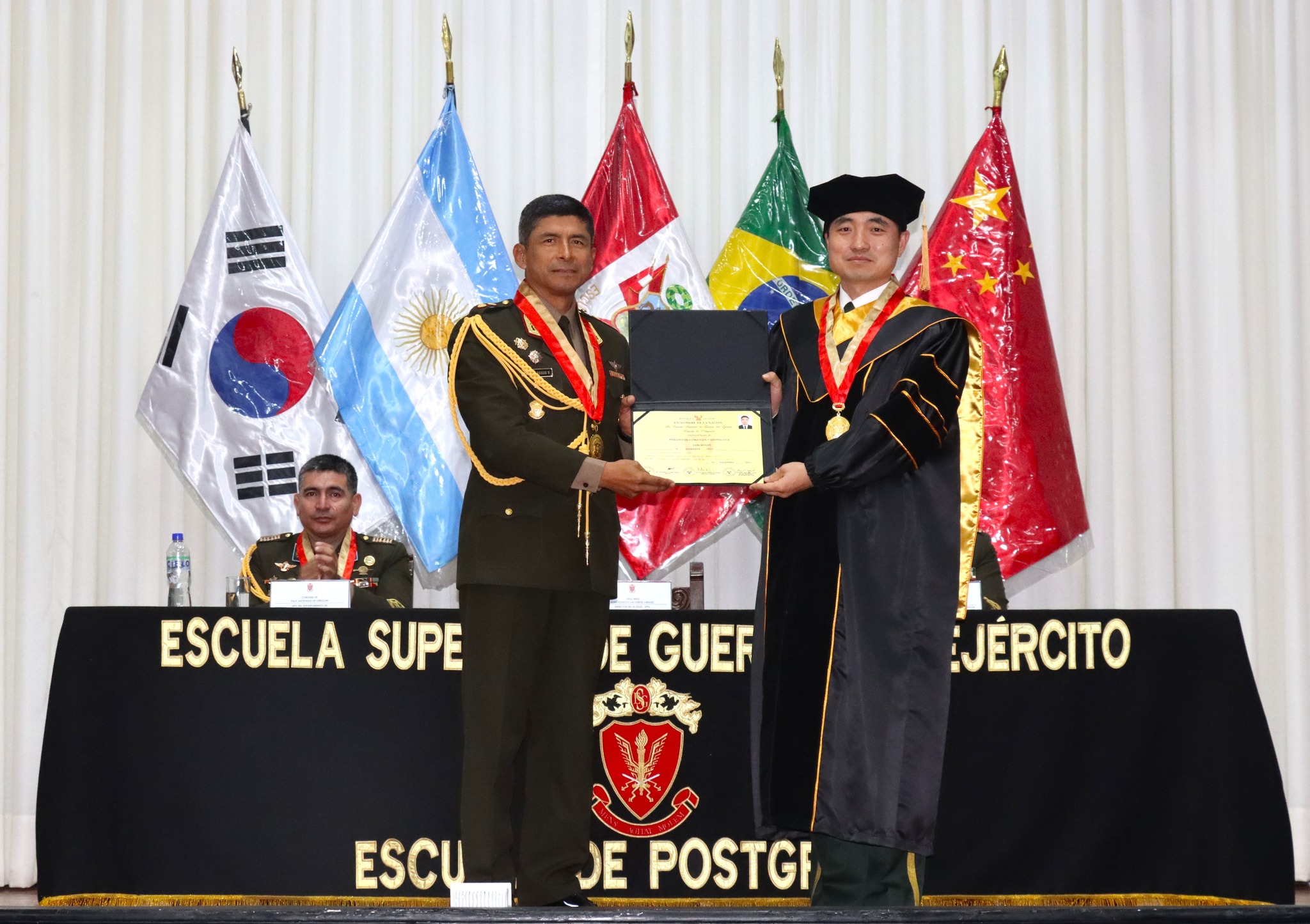 Durante la ceremonia, el señor General de Brigada Juan Valverde Vírhuez, Director de esta prestigiosa casa de estudios, hizo entrega de los diplomas de otorgamiento del grado académico de magister y medallas correspondientes a los señores oficiales maestros promoción 2025; entre ellos, oficiales de las Fuerzas Armadas y Policía Nacional del Perú, y del Ejército Popular de Liberación de la República Popular China, Tte Crl EPL Yan Houyi y Tte Crl EPL He Wang.