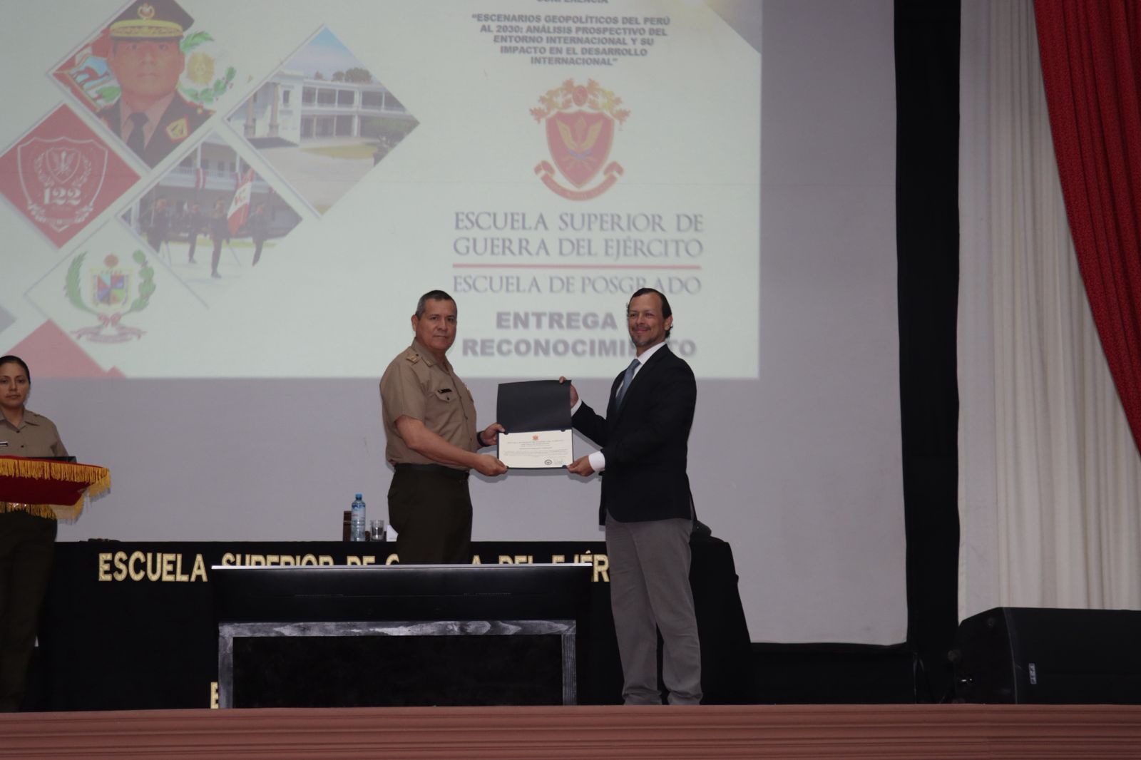 La Escuela Superior de Guerra del Ejército – Escuela de Posgrado llevó a cabo la conferencia magistral “Escenarios geopolíticos del Perú al 2030: análisis prospectivo del entorno internacional y su impacto en el desarrollo nacional”, a cargo del Mg. Giofianni Peirano Torriani, presidente del Centro Nacional de Planeamiento Estratégico.
