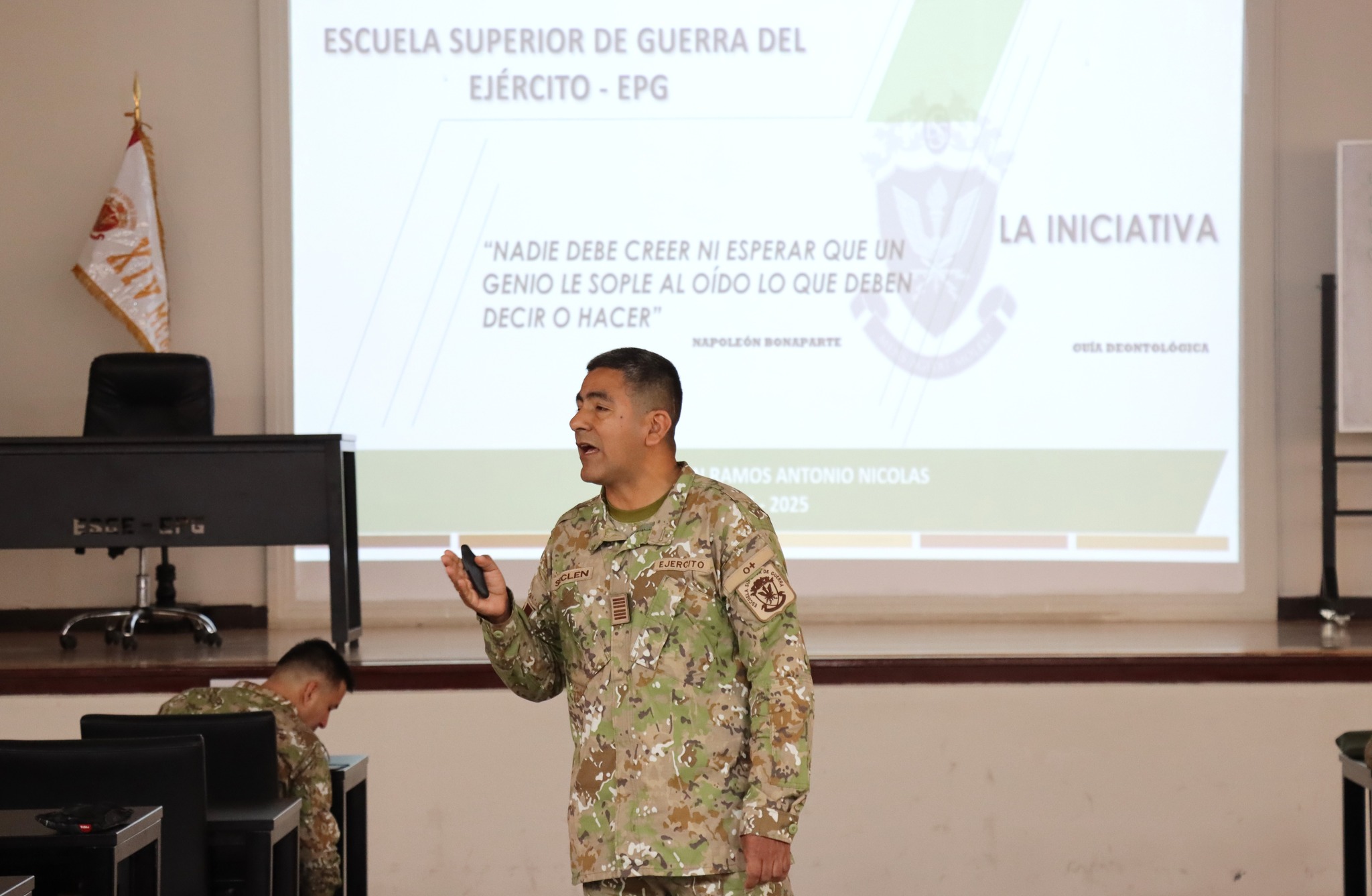 Como parte de la formación integral que ofrece la Escuela Superior de Guerra del Ejército – Escuela de Posgrado a sus oficiales estudiantes, el día de hoy los señores coroneles del Programa de Alto Mando del Ejército (PAME) brindaron una charla de valores a los mayores del Programa de Comando y Estado Mayor (PCEM). Esta actividad tuvo como eje central el valor de la “Iniciativa”, considerado fundamental en la toma de decisiones, el liderazgo en el campo de operaciones y la conducción de personal en contextos complejos.