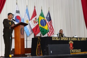 En el marco de la educación integral que brinda esta prestigiosa casa de estudios y acorde a los nuevos desafíos que plantea el mundo contemporáneo; los oficiales estudiantes de la Escuela Superior de Guerra del Ejército – Escuela de Posgrado participaron en una importante conferencia titulada «Adaptación Operacional en un Entorno Multidominio» a cargo del señor General de Brigada Comandante General del Comando Unificado de Pataz.