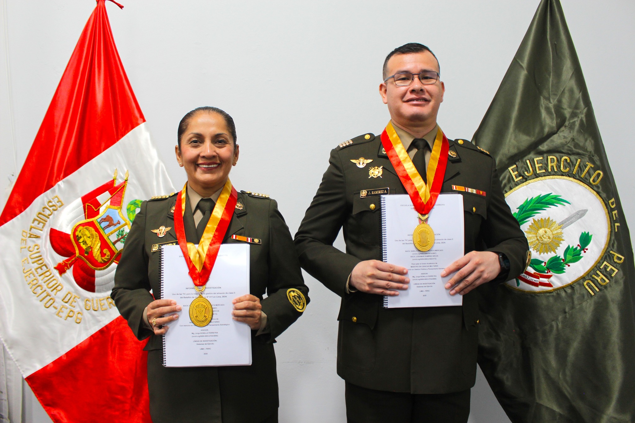La 𝐄𝐬𝐜𝐮𝐞𝐥𝐚 𝐒𝐮𝐩𝐞𝐫𝐢𝐨𝐫 𝐝𝐞 𝐆𝐮𝐞𝐫𝐫𝐚 𝐝𝐞𝐥 𝐄𝐣𝐞́𝐫𝐜𝐢𝐭𝐨 – 𝐄𝐬𝐜𝐮𝐞𝐥𝐚 𝐝𝐞 𝐏𝐨𝐬𝐠𝐫𝐚𝐝𝐨 (ESGE-EPG) se complace en felicitar a los bachilleres 𝐉𝐨𝐬𝐡𝐢𝐦𝐚𝐫 𝐑𝐚𝐦𝐢𝐫𝐞𝐳 𝐀𝐫𝐜𝐨𝐬 𝐲 𝐒𝐚𝐛𝐢𝐥𝐮𝐲 𝐊𝐚𝐭𝐡𝐞𝐫𝐢𝐧𝐞 𝐀𝐜𝐨𝐬𝐭𝐚 𝐌𝐞𝐫𝐜𝐚𝐝𝐨, quienes sustentaron con éxito su tesis titulada. “Uso de las TIC para la mejora de la gestión del almacén de clase II del batallón de Intendencia N° 511, en Lima, 2024.”, para optar el grado académico de Maestro en Ciencias Militares con mención en Gestión Pública y Planeamiento Estratégico.