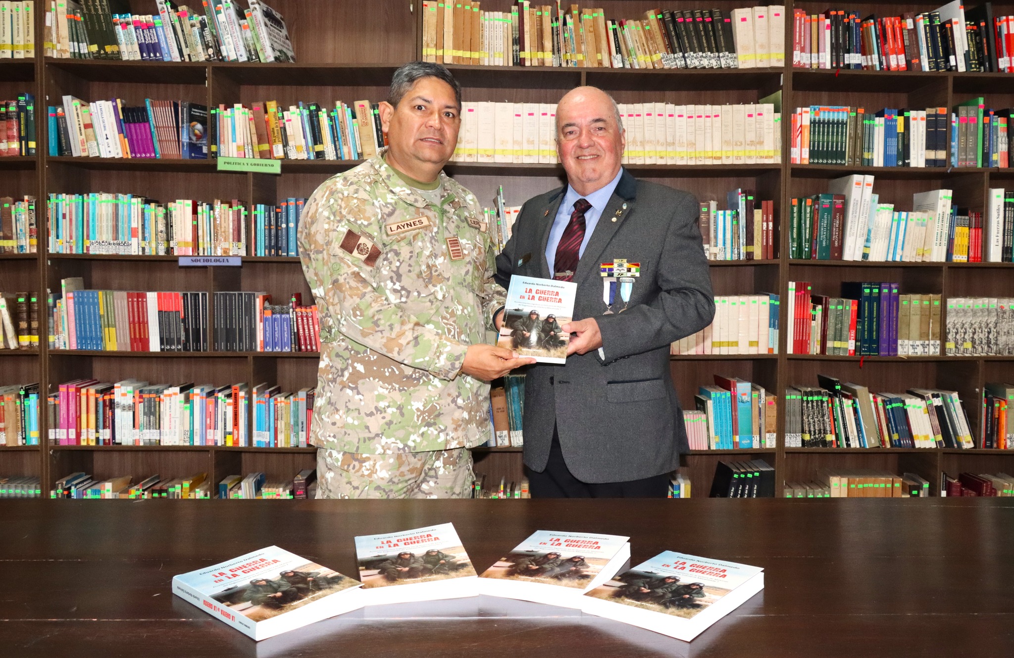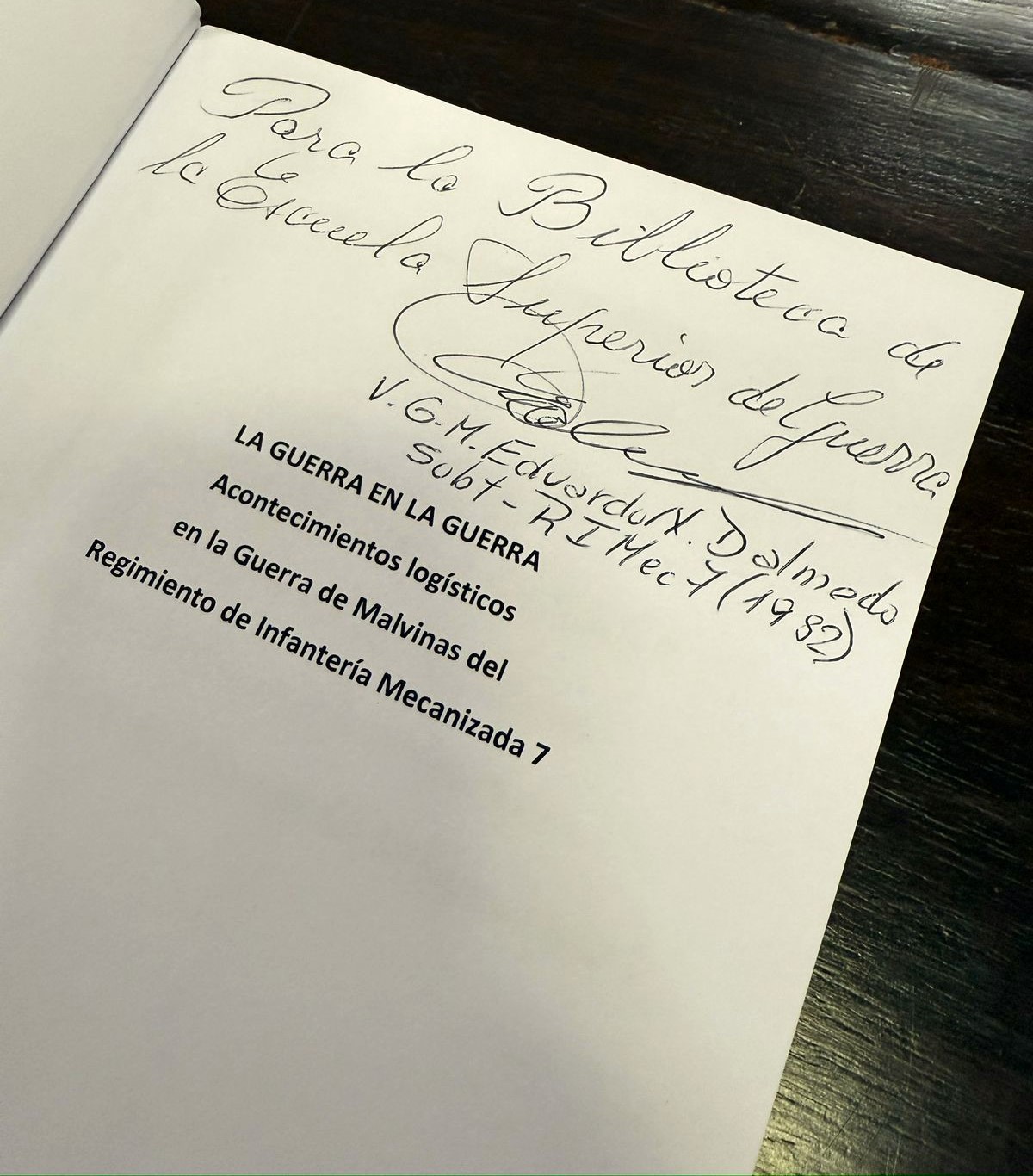 El Mag. Eduardo Norberto Dalmedo, ex capitán y veterano de la Guerra de las Malvinas de Argentina, tuvo a bien realizar la donación de ejemplares de su obra titulada “La Guerra en la Guerra – Acontecimientos Logísticos en la Guerra de las Malvinas del Regimiento de Infantería Mecanizada 7”. Esta valiosa producción intelectual se incorpora al acervo bibliográfico de la biblioteca de la Escuela Superior de Guerra del Ejército – Escuela de Posgrado (ESGE – EPG).