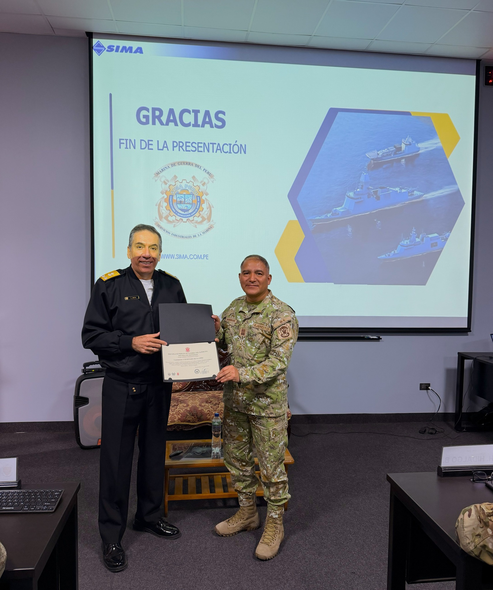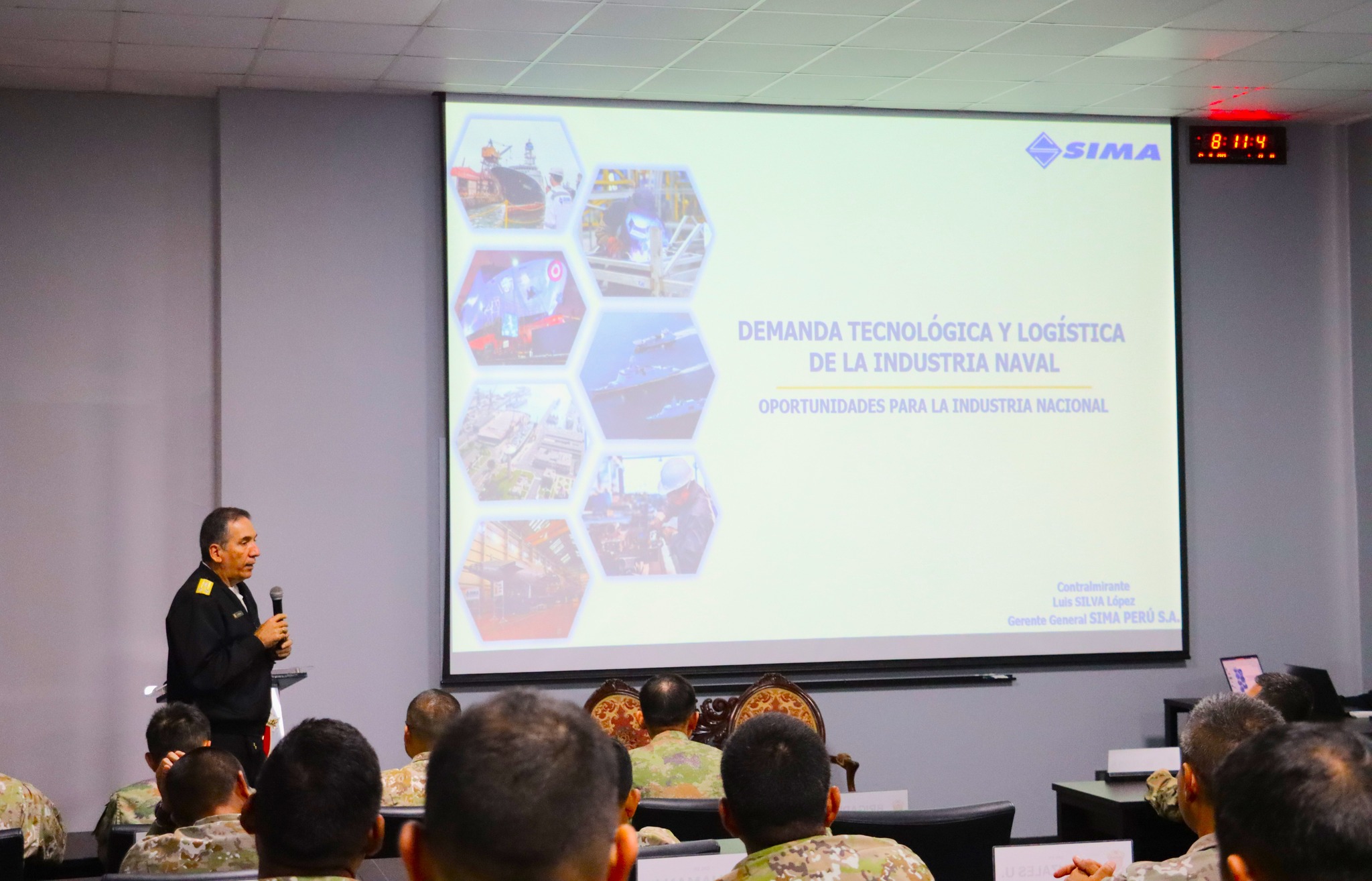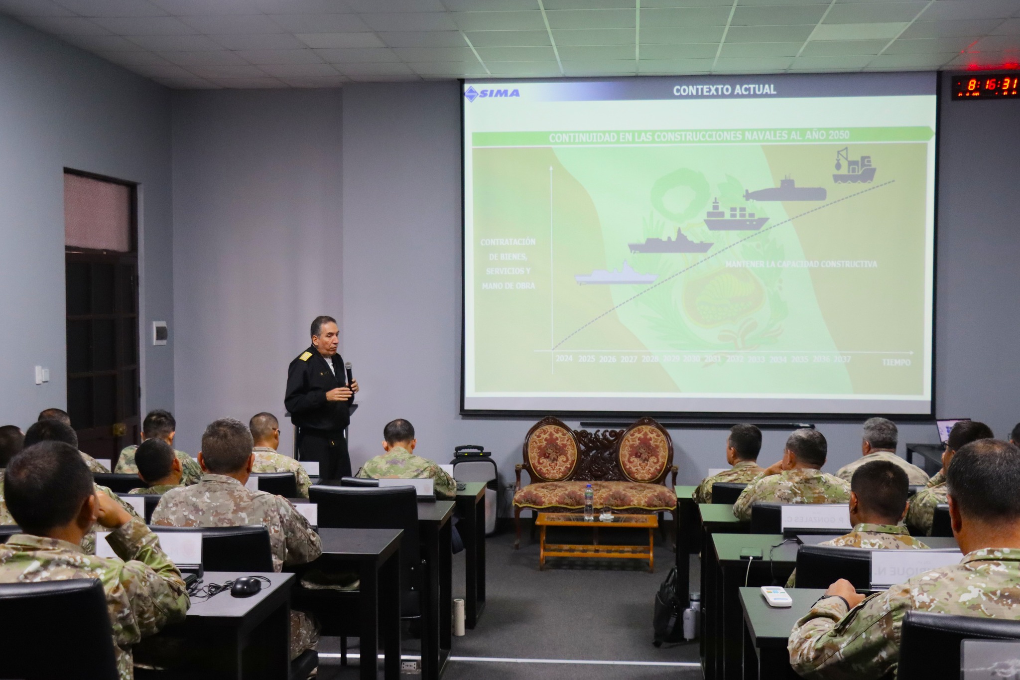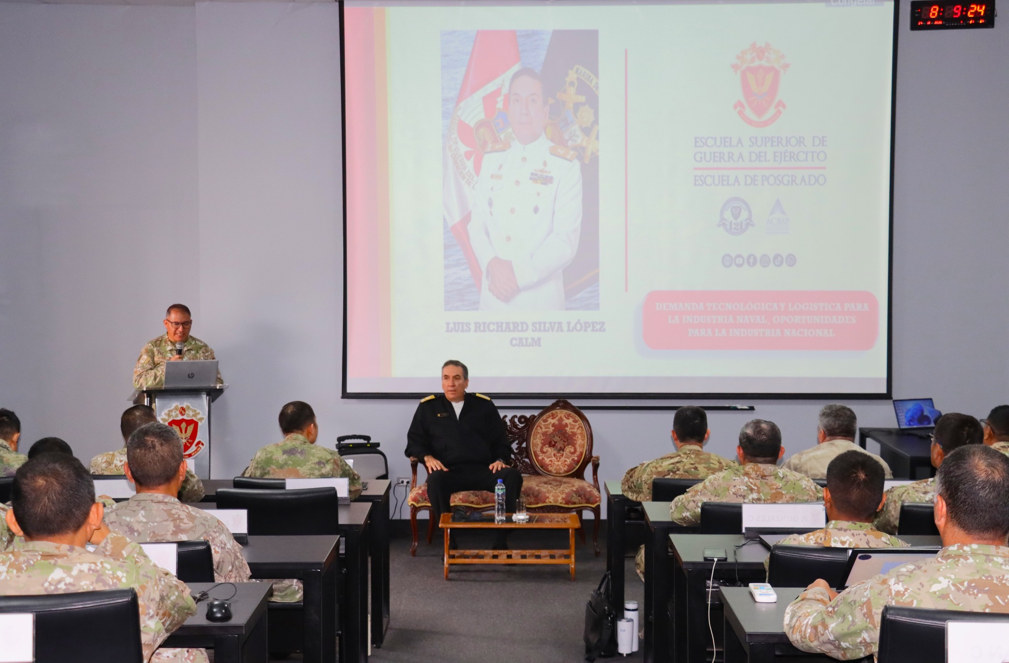 En un espacio de reflexión sobre el futuro tecnológico y logístico del país, los oficiales del Programa de Alto Mando del Ejército (PAME) participaron en una importante conferencia a cargo del Contralmirante Luis Richard Silva López, Gerente General de los Servicios Industriales de la Marina S.A. (SIMA), titulada “Demanda tecnológica y logística de la industria naval: Oportunidades para la industria nacional”.